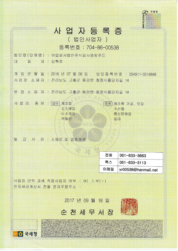 주소 : 전남 고흥군 동강면 청정식품단지길 14 어업회사법인 (주)열림푸드